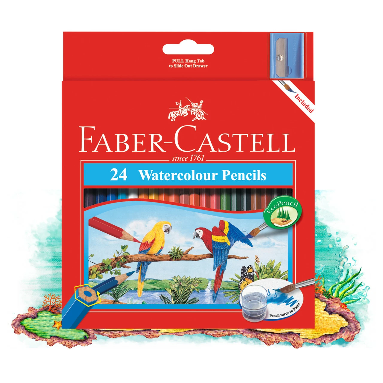 This pack includes 24 Faber-Castell Watercolour Pencils, 1 bonus paint brush and 1 bonus sharpener in a durable wallet for easy storage.