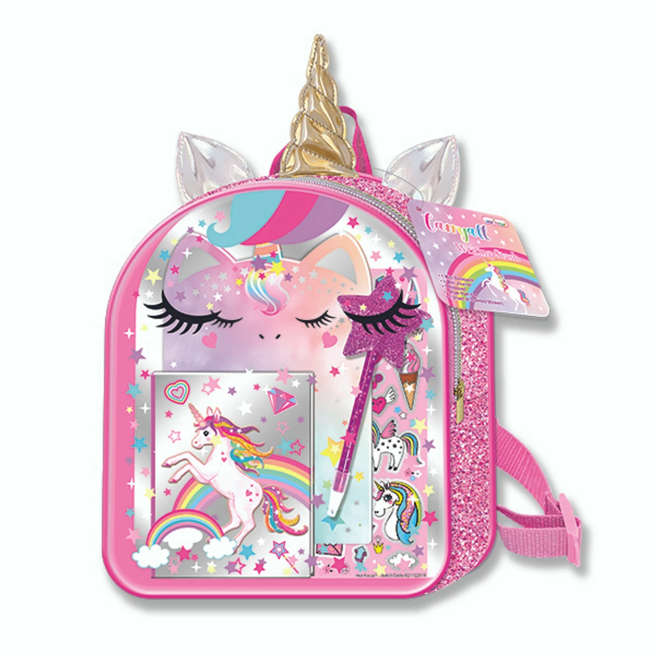 This trendy backpack is filled with all the fun stationaries you need on the go. Comes with one mini journal, notebook, scented stickers and a pom pom pen.