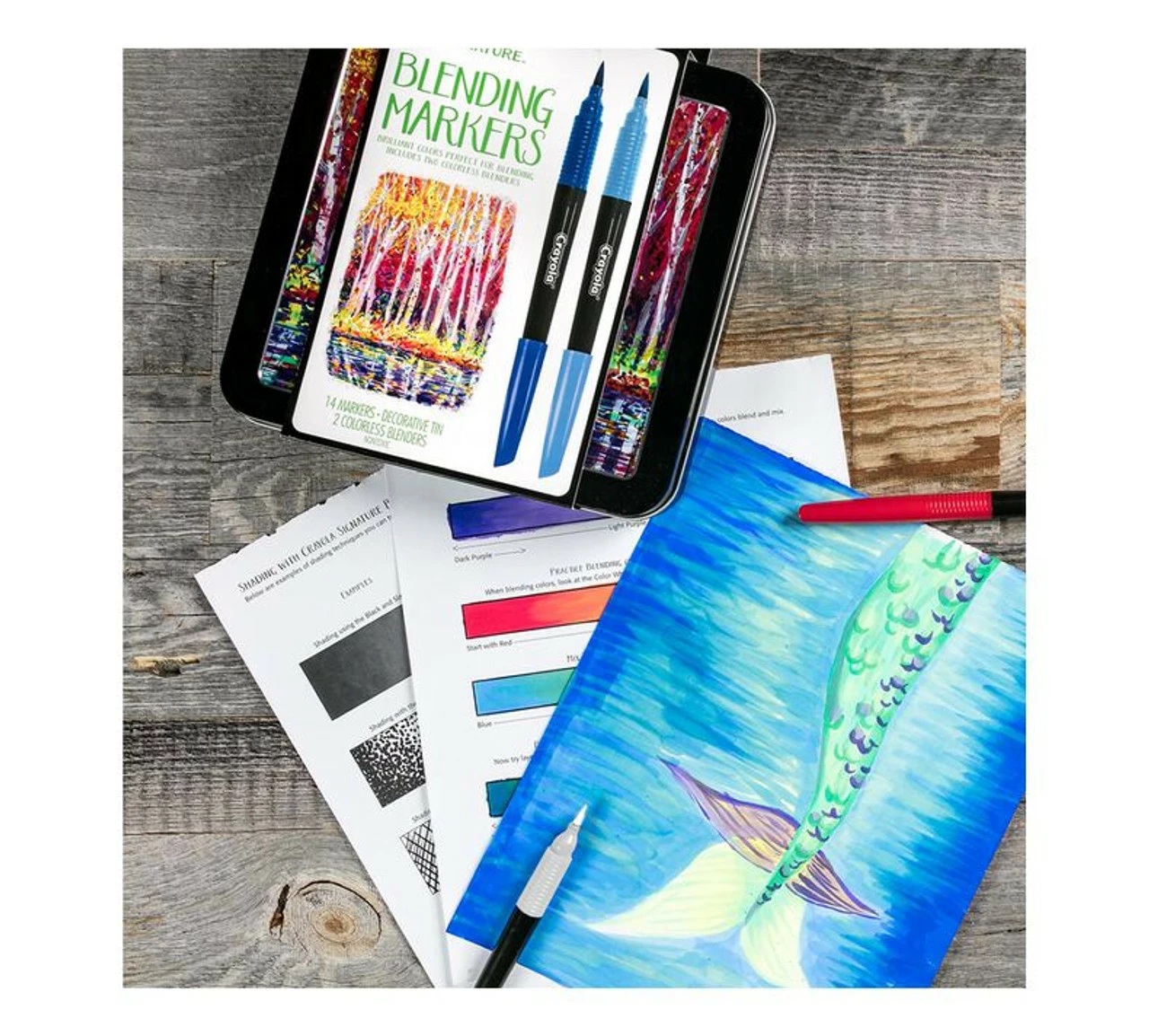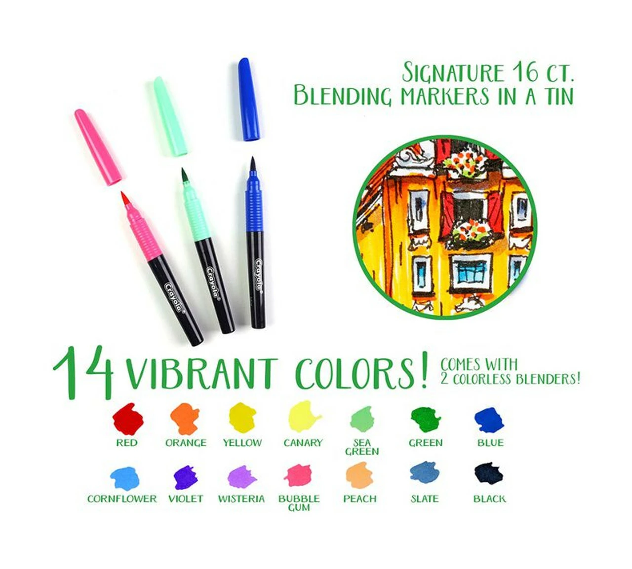 Signature Blending Markers provide great creative versatility in coloring and art projects. Sketch, draw, add texture, and blend colors for unique outcomes. A great art technique for taking your adult coloring to the next level! Includes 14 Crayola Blending Markers in brilliant colors (7 colors in light and dark variations) and 2 Colorless Blending Marker; all organized in a decorative Storage Tin.