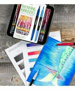 BLENDING MARKERS & DECORATIVE TIN: Features 14 Vibrant Colour Markers, 2 Colourless Markers for blending, and a Marker Storage Case.