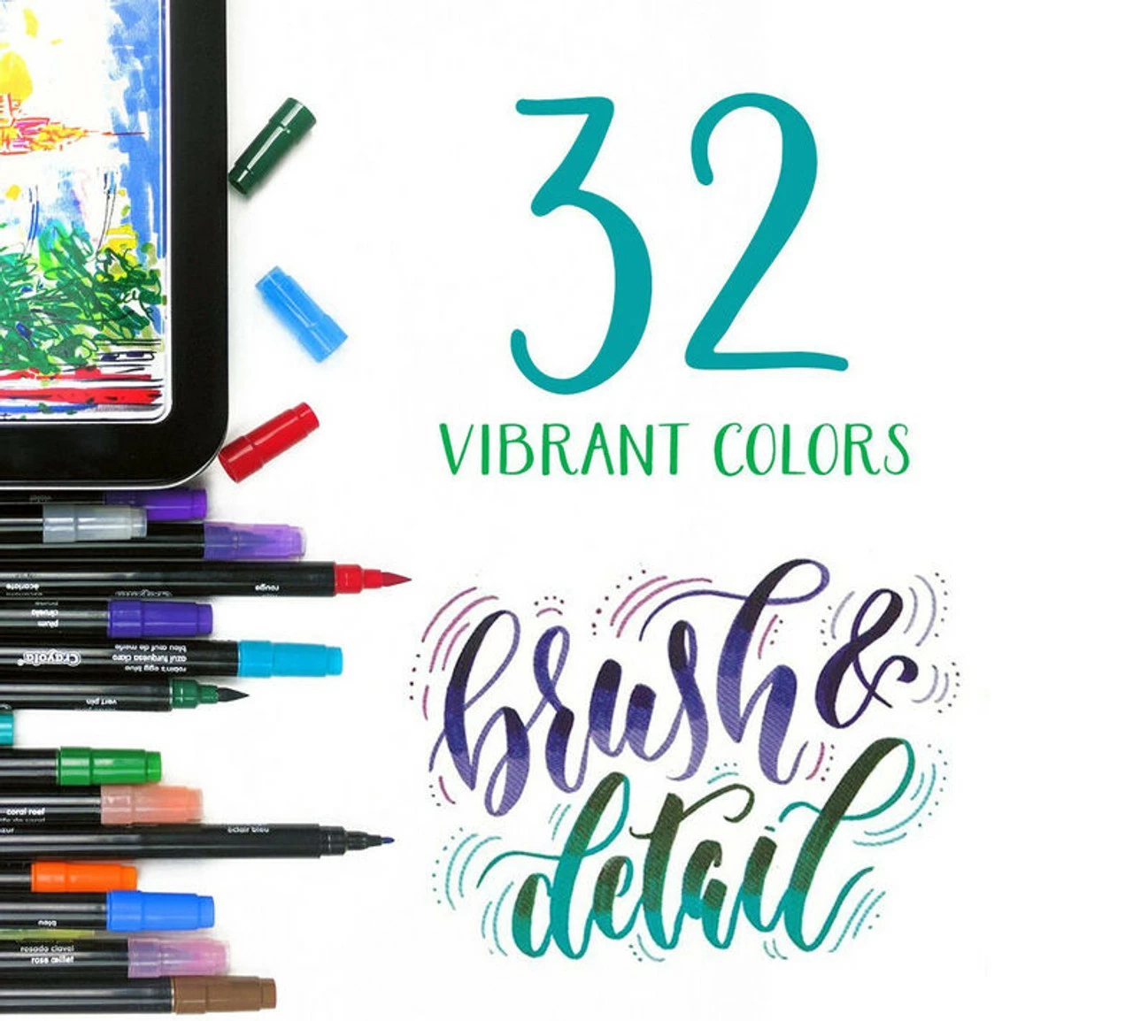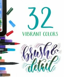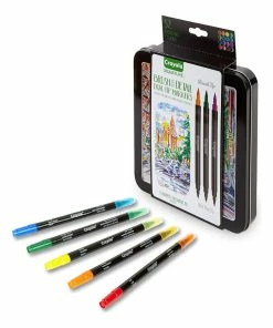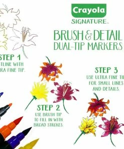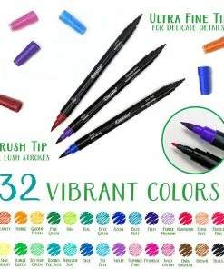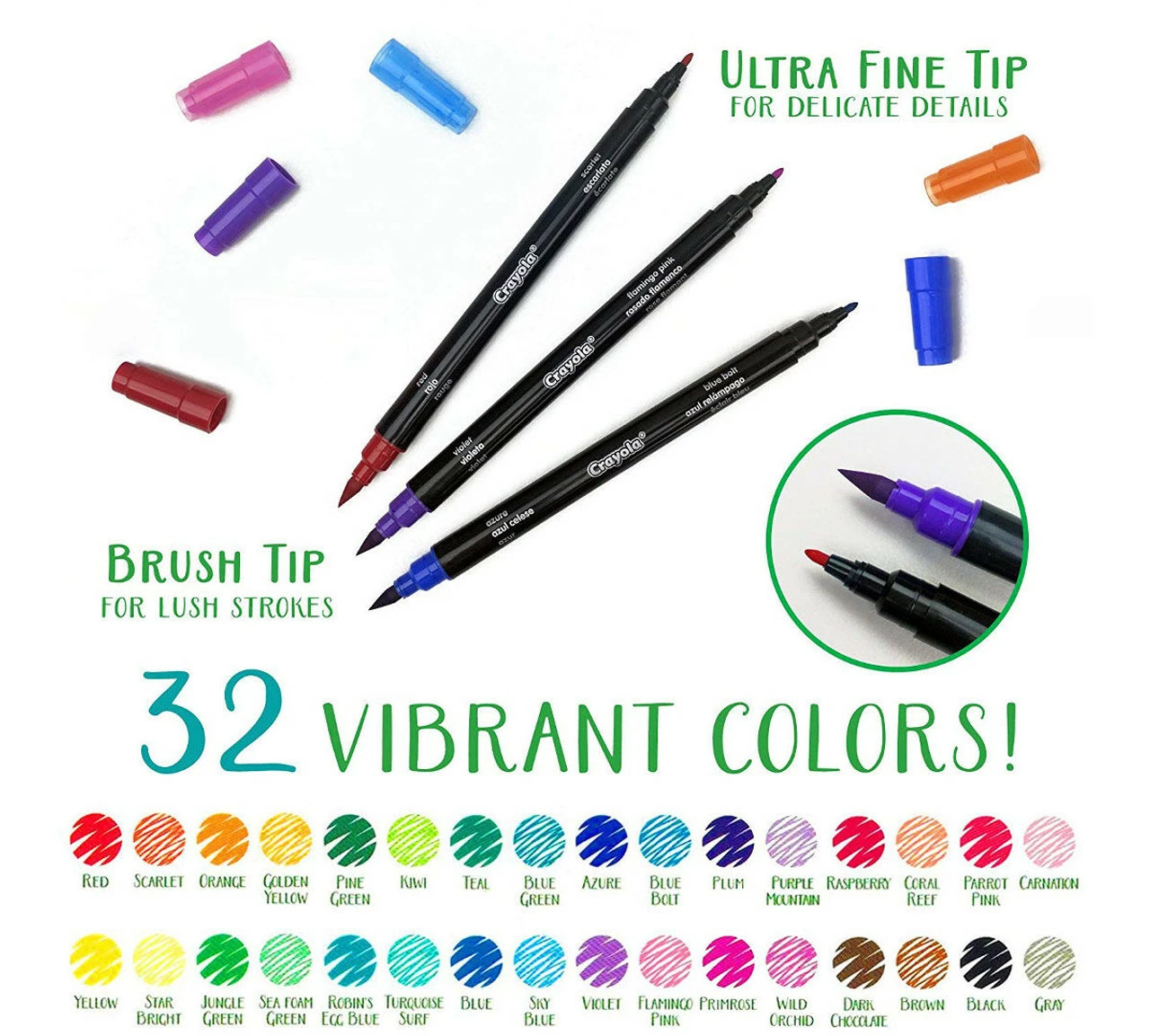 - Dual-ended markers feature a brush tip and ultra-fine tip for thick and thin lines.