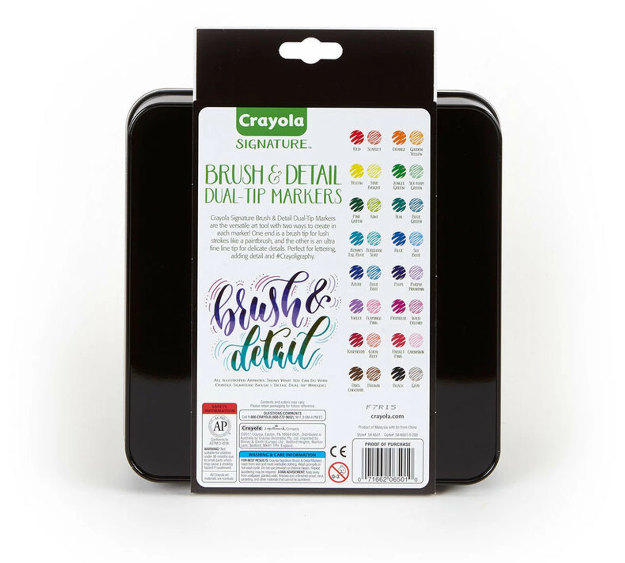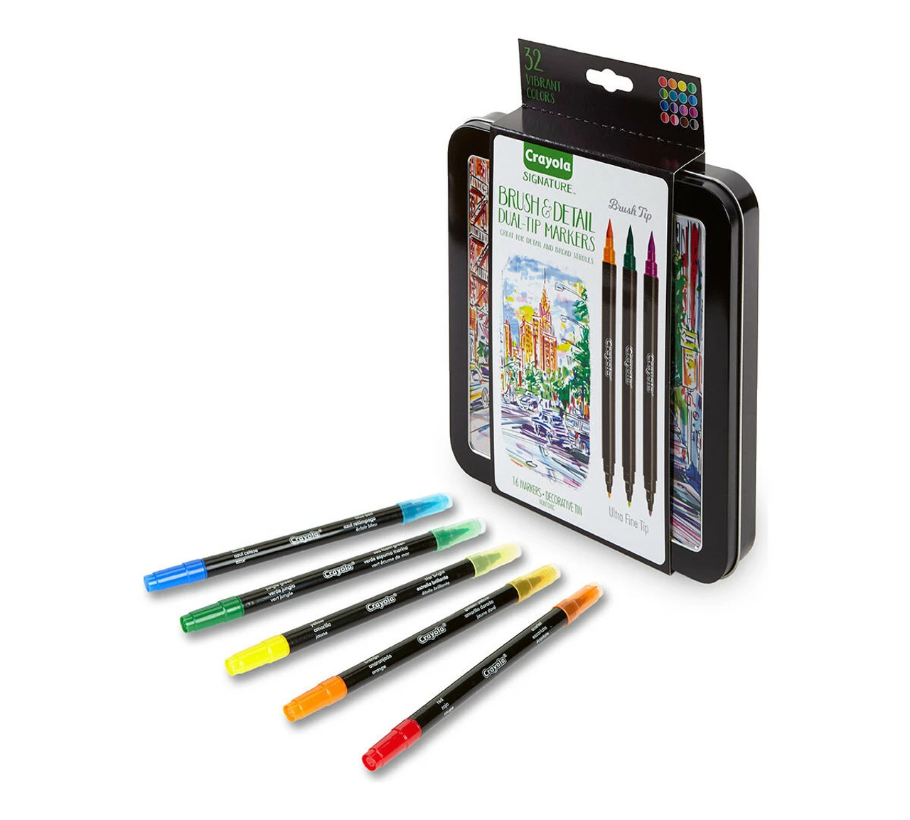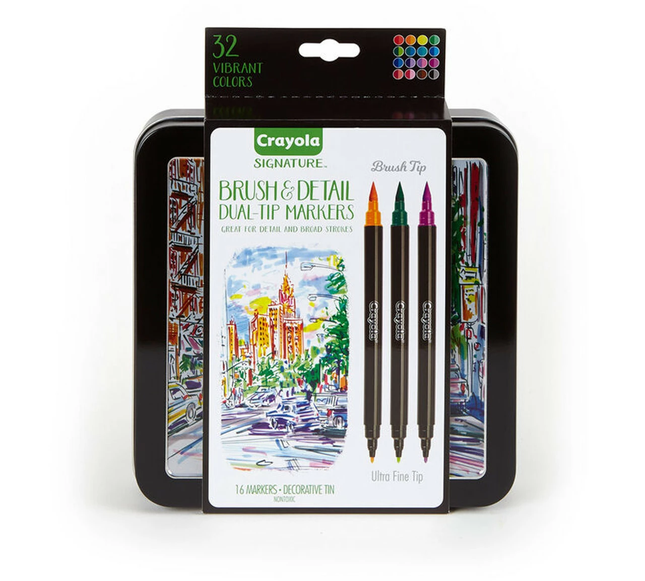 Customize your writing, drawing, and coloring with Brush & Detail Dual-Tip Markers. Each art marker features a brush tip and an ultra-fine tip and delivers 2 complementary colors for twice the versatility and double the coloring fun. Use these art tools to practice hand lettering or calligraphy, too! A perfect gift for artists of any age, the dual-ended markers come in a decorative tin that helps ensure they stay in pristine condition between uses. Plus, this gorgeous storage tin is something your recipient can proudly display!