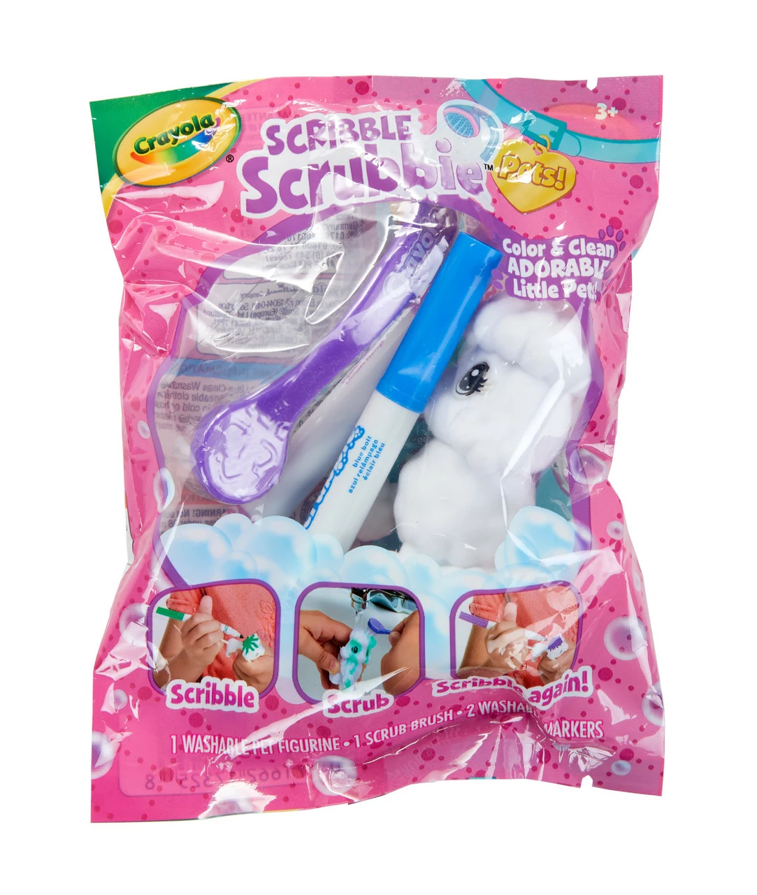 Crayola Scribble Scrubbie Pets bring crafts to life with washable animal figures that kids can customize again and again! Use washable markers to add unique designs to these fuzzy animal figures. When you’re ready for something new, run water over them and use the included scrub brush to get them cleaned up. Would-be groomers can colour, wash, and repeat as often as they like! Each pack includes 1 Scribble Scrubbie Pet, 1 Scrub Brush, and 2 Washable Crayola Markers. Makes a great holiday or birthday gift for girls and boys. Safe and nontoxic, ideal for children ages 3 and up.