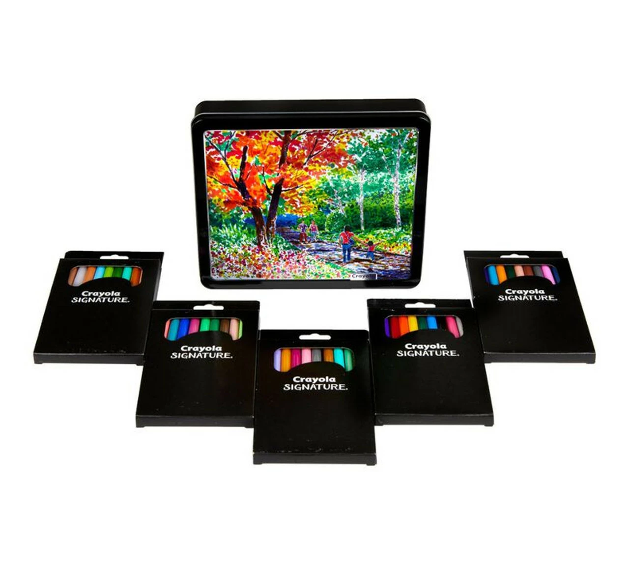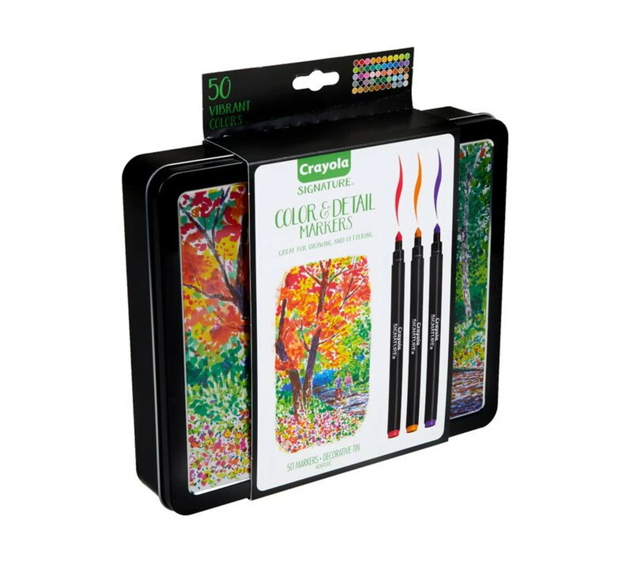 Create elegant works of art with Crayola Signature Color and Detail Markers! This sophisticated Signature Marker Set features 50 Art Markers in a range of beautiful, assorted colors. Choose from vibrant shades, dark hues, or subtle neutrals to add depth and highlights to your artwork! Specially designed tips make it easy to draw both thick or thin lines, color in large areas, or add intricate details. The Decorative Storage Tin is perfect for keeping your art supplies safe and organized or even putting them on display. Makes a great holiday or birthday gift for teenagers or adults who love to color!