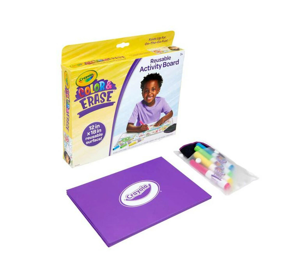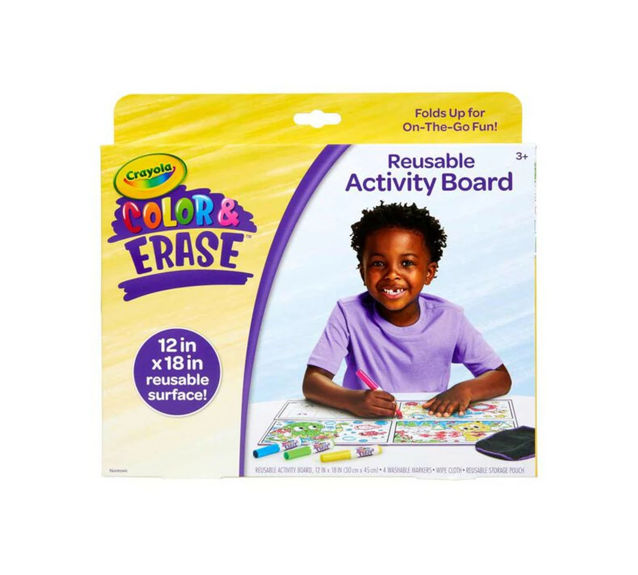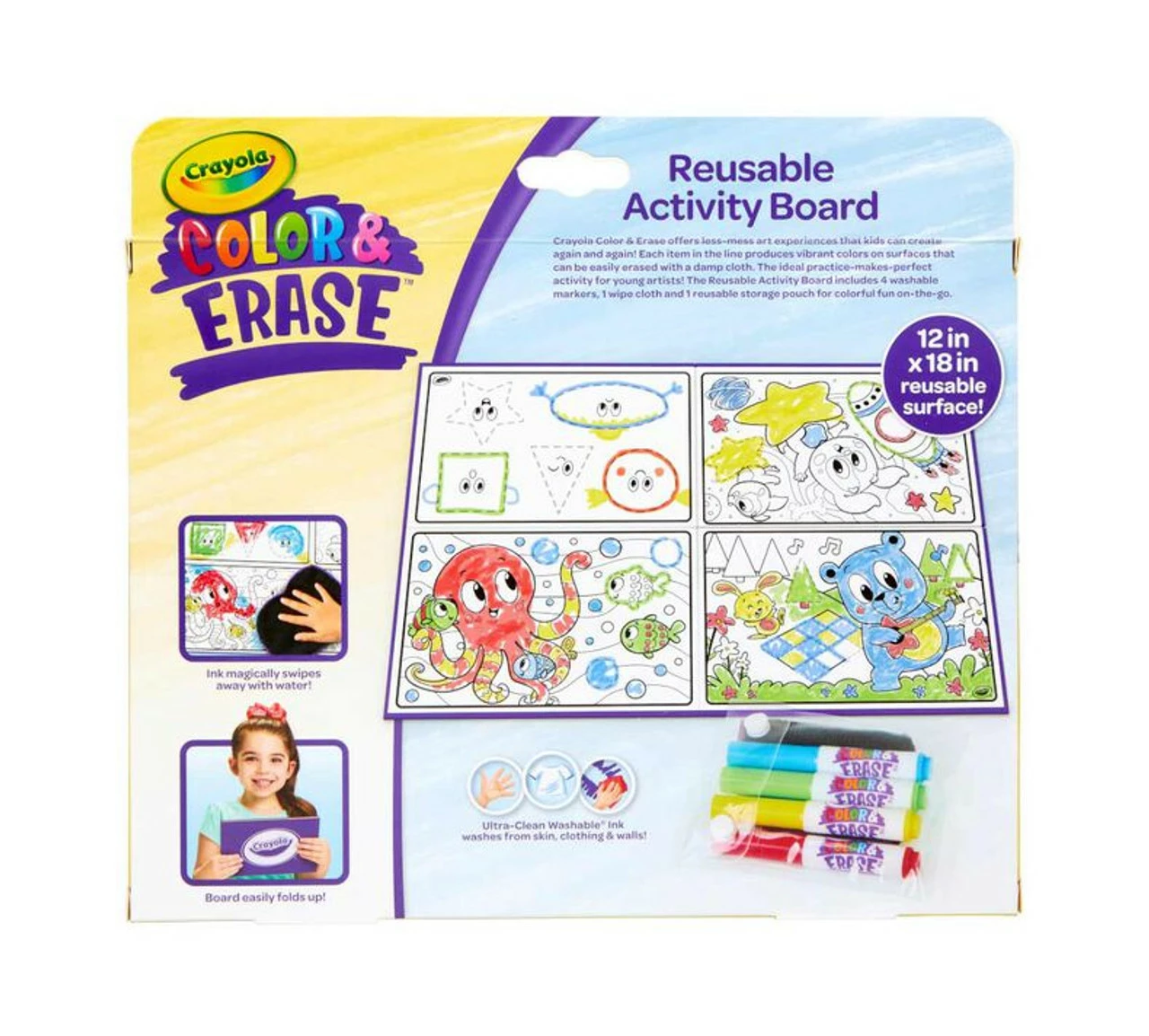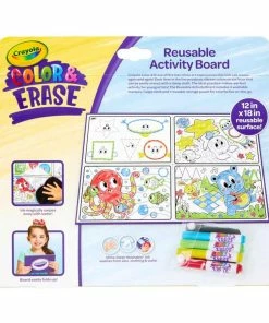 - CRAYOLA Colour & ERASE REUSABLE ACTIVITY BOARD: Includes 12″ x 18″ Reusable Activity Board, 4 Washable Markers, and 1 Wipe Cloth.