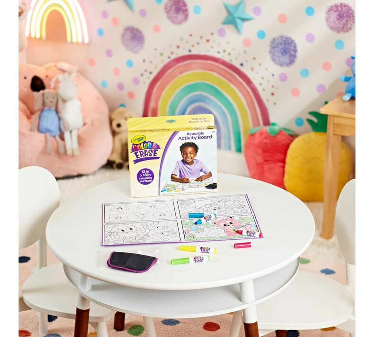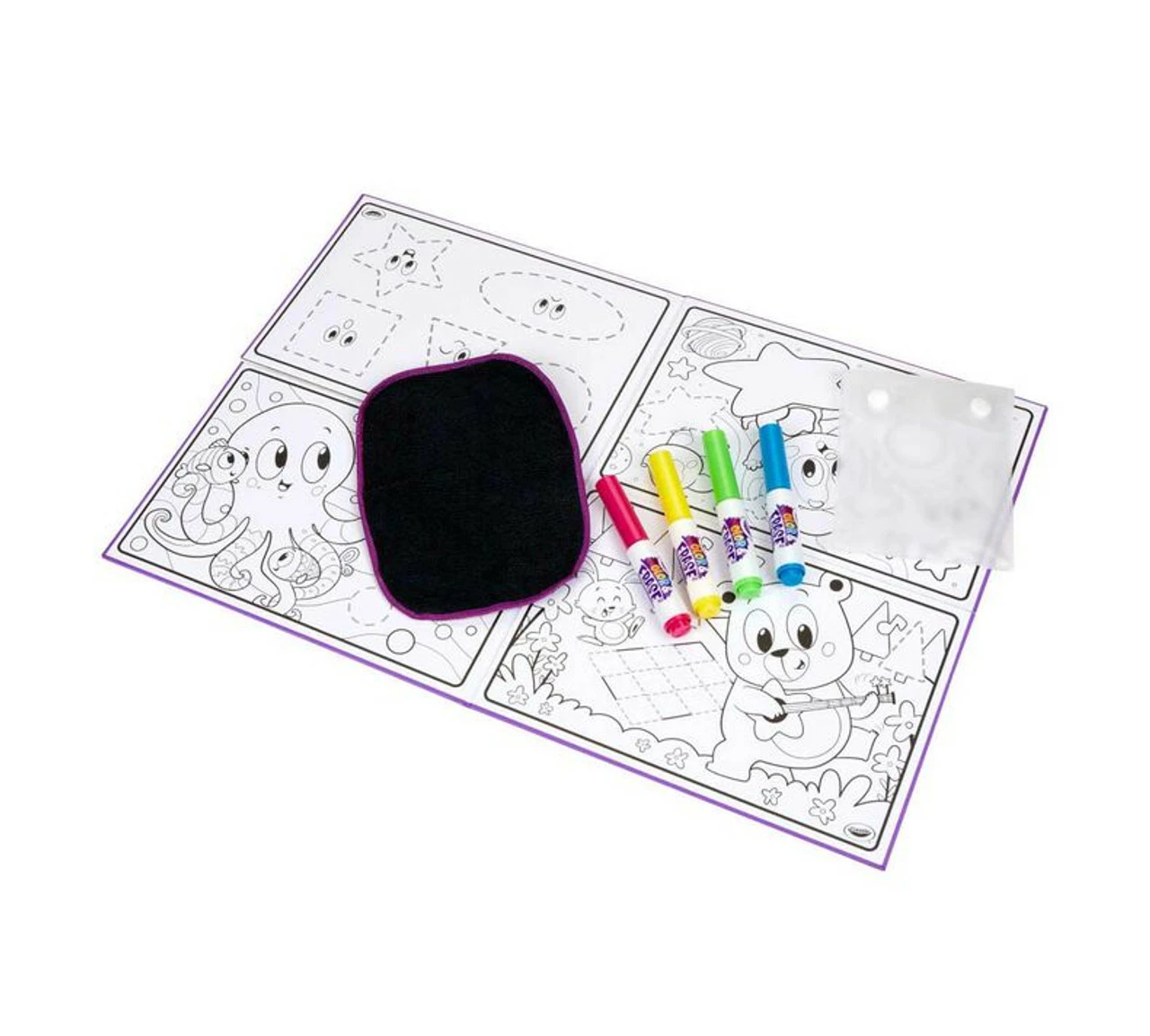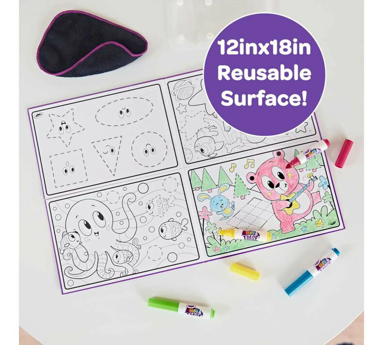 - CRAYOLA Colour & ERASE REUSABLE ACTIVITY BOARD: Includes 12″ x 18″ Reusable Activity Board, 4 Washable Markers, and 1 Wipe Cloth.