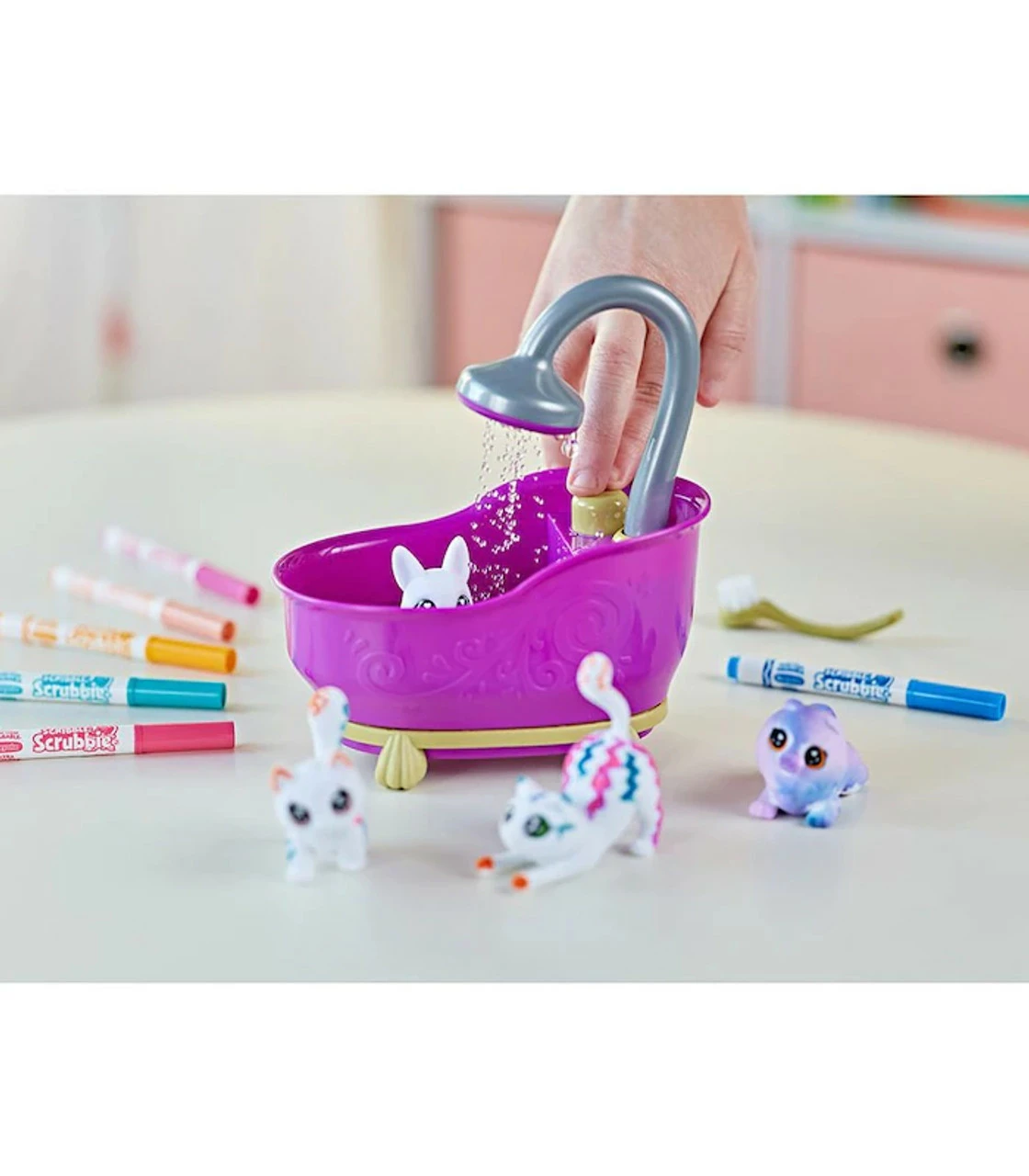 Splish splash in the bath with the Scribble Scrubbie Pets Tub 2.0! Set aside your traditional colouring books and choose a pet to colour instead of with 6 washable markers for kids. Just pick a colour and add unique designs to each adorable animal figure! When you’re ready for something new, POP ‘em in the purple scrub tub and use the scrub brush to get them cleaned up. Kids can even use the kid-powered shower to rinse their little friends in style! This fun toy for girls and boys comes complete with 4 animal figurines, 6 washable markers, 1 scrub brush and bathtub. For even more washable fun, kids can grow their Scribble Scrubbie squad with additional expansion packs (sold separately).