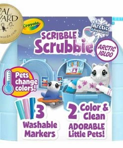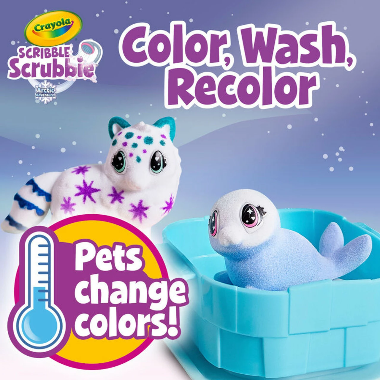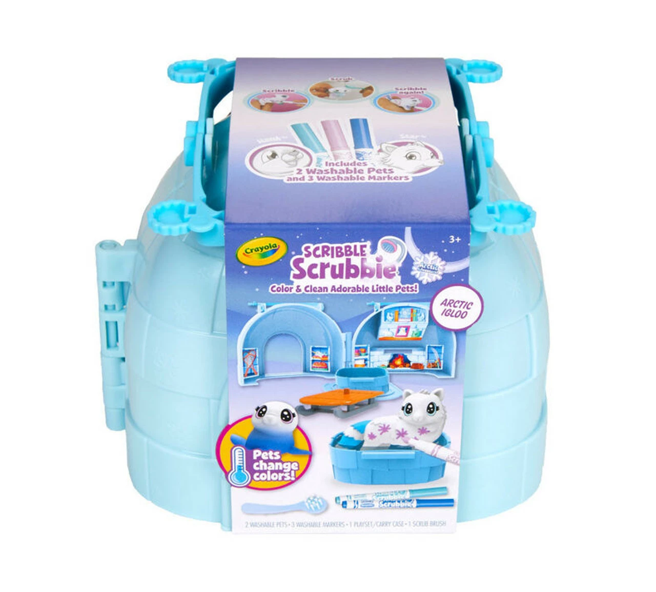 - CRAYOLA SCRIBBLE SCRUBBIE ARCTIC PETS IGLOO: Includes 1 plastic Igloo environment doubling as a storage case with foldable handles, 2 new colour change pets, 3 markers, 1 brush, and 1 plastic tub.