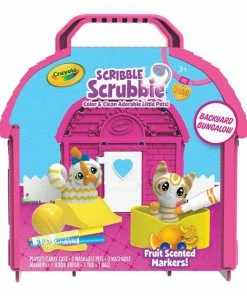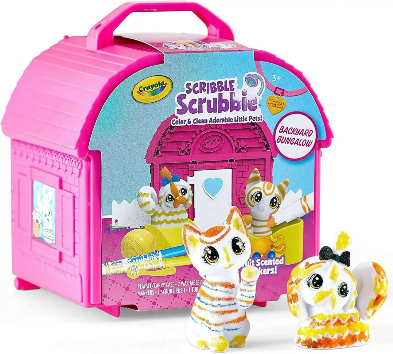 The Crayola Scribble Scrubbie Backyard Bungalow is the ideal play space for your miniature pets! Take these adorable toy pets “outside” for a colourful afternoon of fun. Each animal figurine has a flocked white coat that can be easily customised. Decorate your fuzzy friends with the included washable markers to give them a sweet, fruity scent! All Crayola Scribble Scrubbie figures are washable, allowing you to colour and customise them with the included Washable Markers, then wash them and start over. Expand your pet collection with more Scribble Scrubbie expansion packs (sold separately). This backyard playset includes two Scribble Scrubbie Pets, a tub, a scrub brush, three washable markers, and a pet house that also serves as storage.