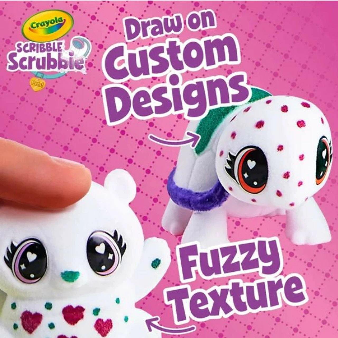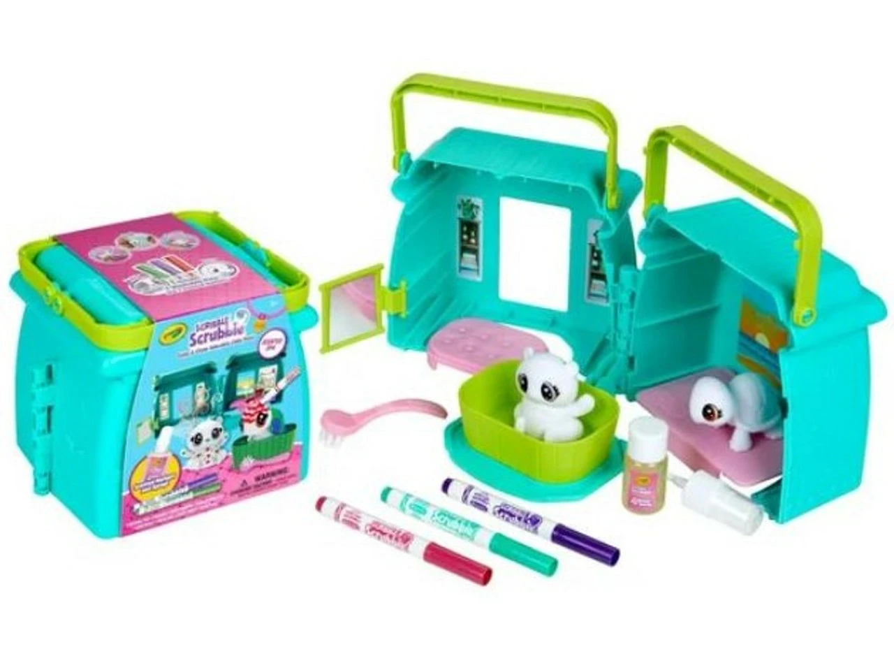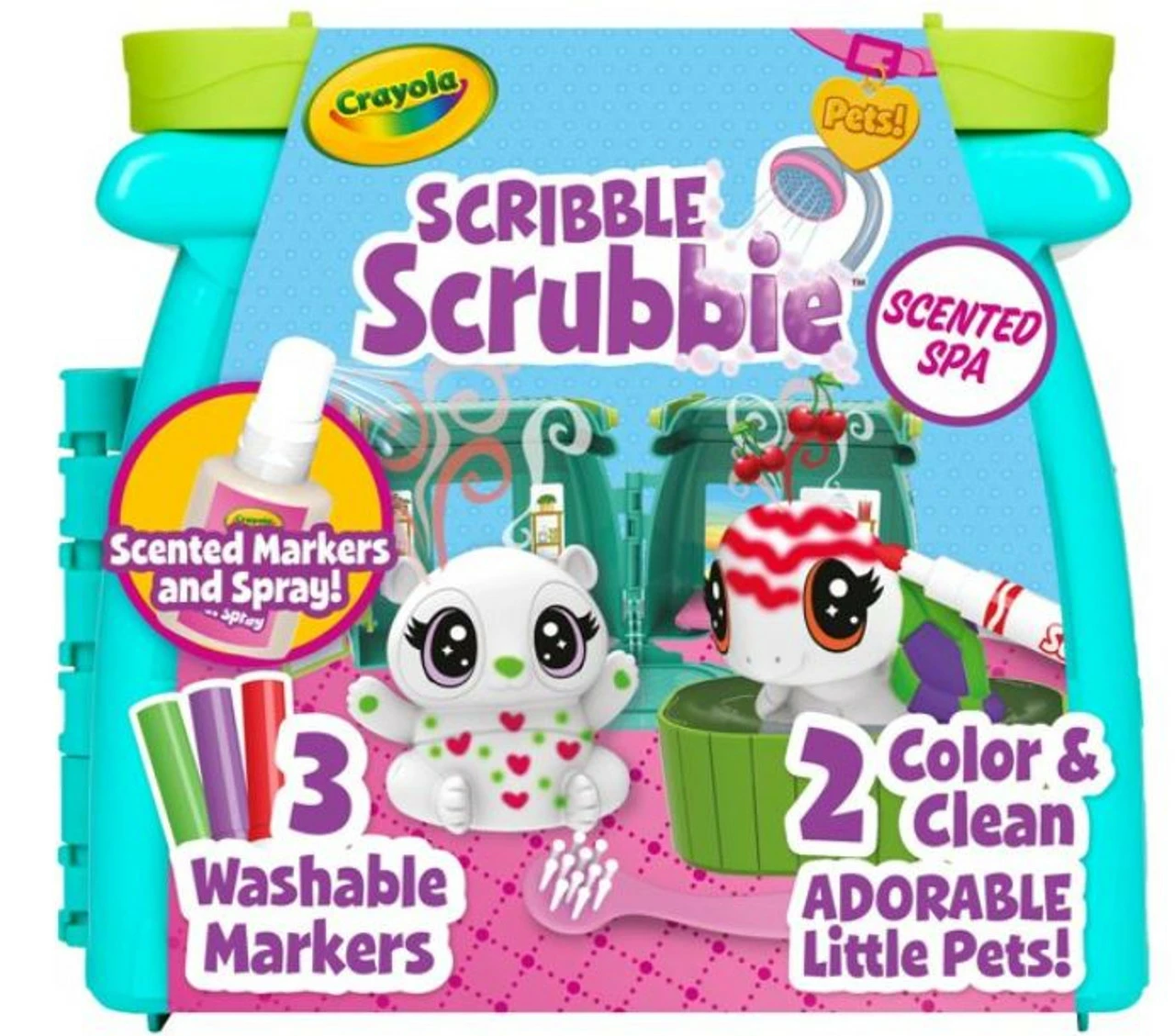 Product details Customize and pamper cute little pets with the Scribble Scrubbie Pets Scented Spa! This super cute playset offers hours of imaginative play and encourages kids to expand Scribble Scrubbie playtime with sweet scented washable markers and spray. Kids can create custom colourful patterns on their pets with washable markers, then wash pets clean to create new patterns again and again. Scribble Scrubbie Pets are engaging, creative toys for girls and boys. The set doubles as a storage case with foldable handles.