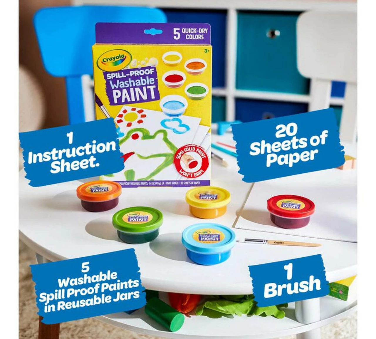 Keep craft time simple with Crayola Spill Proof Washable Paints! This less mess paint set features 5 Jars of Spill Proof Paint (40mg each), 1 Paint Brush, 20 Sheets of Paper, and 1 Instruction Sheet. Unlike traditional paints, Crayola Semi Solid Paints prevent spills, drips, and messes. Even better, these kids paints require little set up or clean up to use. When changing colors, simply wipe the brush on a damp cloth to keep your palette clean. Paint colors work well on most paper and dry quickly to prevent smearing. Makes a great holiday or birthday gift for kids. Safe and nontoxic, ages 3 and up.