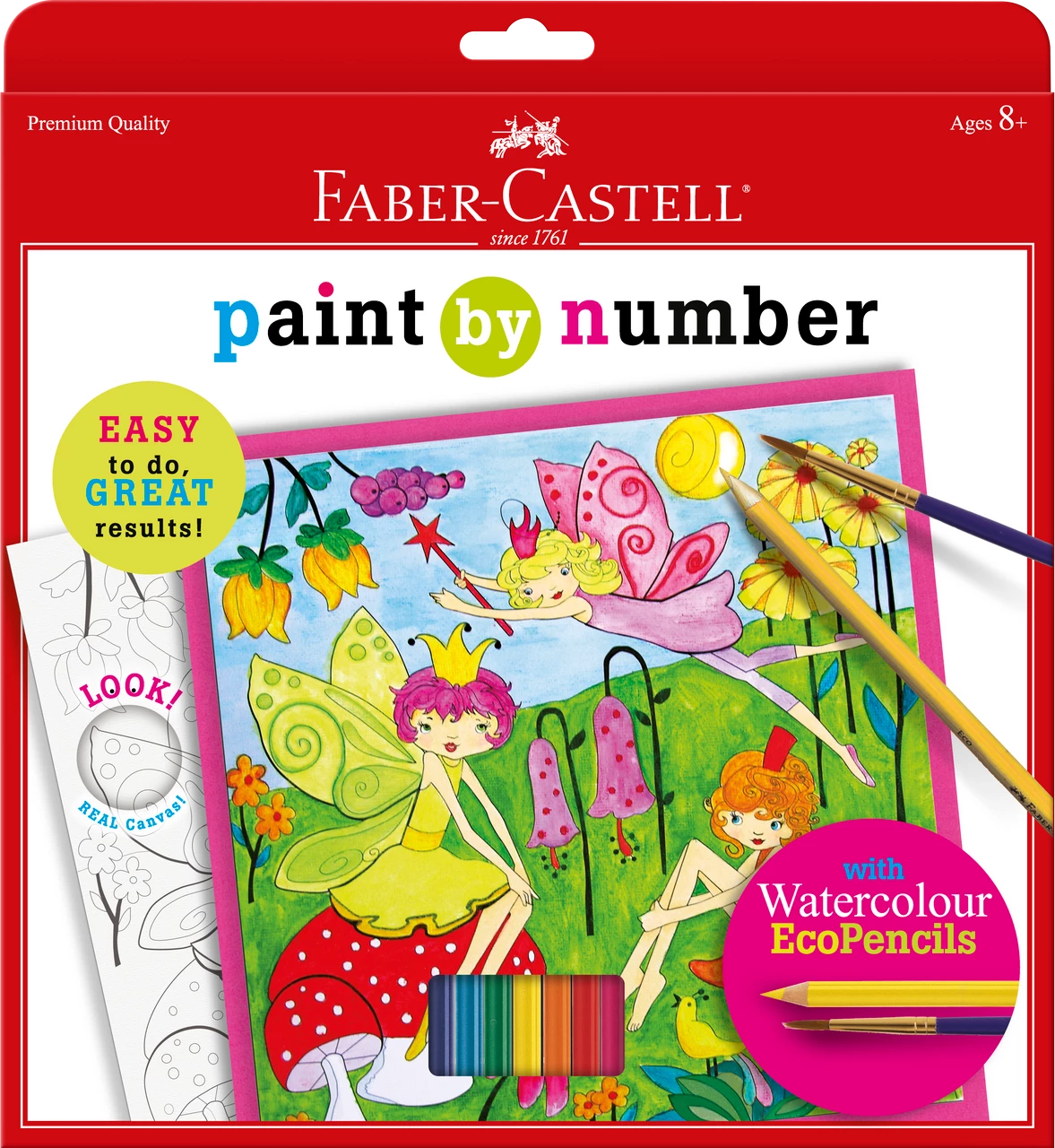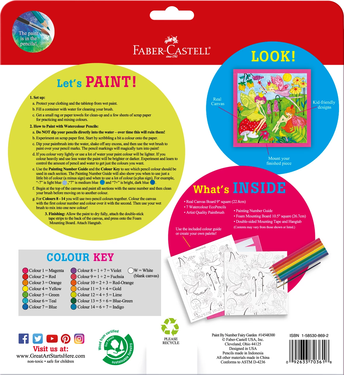 This set includes everything needed to create a beautiful finished artwork: 7 Watercolour EcoPencils (Magenta, Red, Orange, Yellow, Green, Teal, Blue) 1 23cm Square Pre-printed Artist Canvas 1 Numbered Colour Guide, 1 Paint Brush 1 Foam Mounting Board Double-sided Mounting Tape Hang Tab
