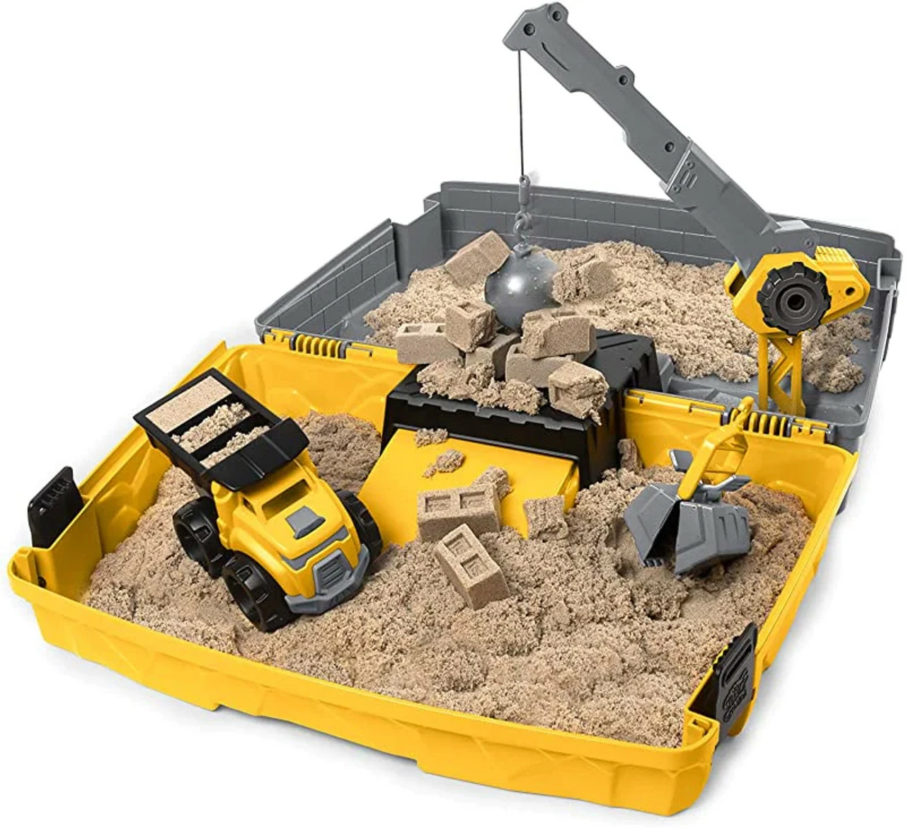 Dig, build and crush with the Kinetic Sand Construction Site! This construction-themed folding sandbox playset has everything you need to create your own construction site: 2lbs of brown Kinetic Sand, a dump truck, and a working crane with wrecking ball and bucket attachments! Kinetic Sand is the original magical, mouldable and mesmerizing sand. It flows through your hands and never dries out, so you can play again and again. Open up the sandbox to discover a contained play space and build out your site. Use the crane’s bucket to dig up Kinetic Sand and fill the dump truck, then pack the sand into the dump truck and mould three bricks at a time! Build a wall on the brick platform, and when it’s time to demolish, hook the wrecking ball onto the crane and swing to smash it! Squish your crushed wall and rebuild again and again! When you’re finished playing, pack everything inside the sandbox until next time, or take your Construction Site with you on the go! For even more construction fun, use the Pave & Play Set and the Dig & Demolish Set (each sold separately) with the Construction Site. Let Kinetic Sand flow through your hands – it’s so satisfying, you won’t be able to put it down! The perfect gift for kids, Kinetic Sand is made from natural sand and is wheat, gluten and casein free. Have endless construction fun with the Kinetic Sand Construction Site!