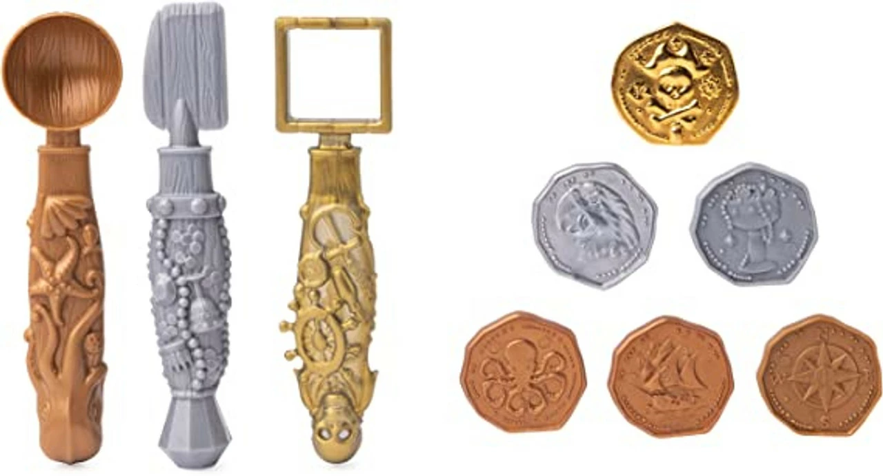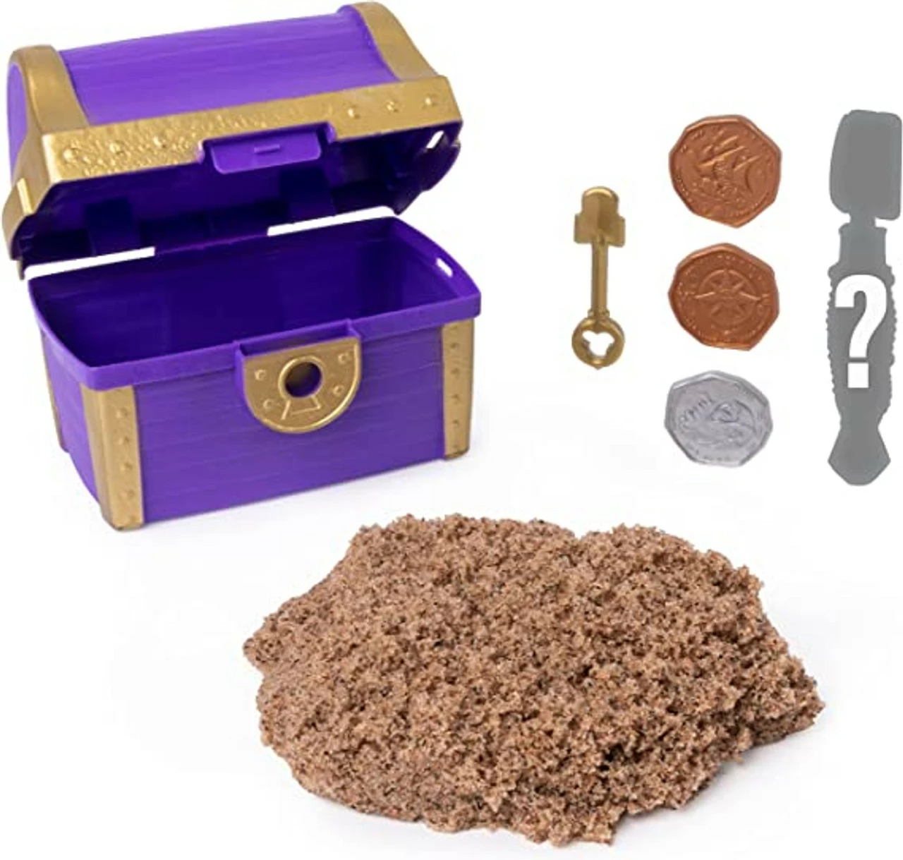 Now you can dig for gold with the Kinetic Sand Buried Treasure Set! Use the key hidden on the bottom of the playset to unlock your treasure chest! Inside, you’ll discover a chest filled with Kinetic Beach Sand (the key works as a shovel!). Find your hidden tool buried inside – it will help you scoop, transform or shovel your Kinetic Sand! Dig until you uncover three bronze or silver coins, and you may even find the rare gold coin! When you’re finished playing, the reusable treasure chest is the perfect storage solution for your Kinetic Sand. Kinetic Sand is the original magical, mouldable and mesmerizing sand. It flows through your hands and never dries out, so you can play again and again. Go on a treasure hunt with the Kinetic Sand Buried Treasure Set! Will you find the rare gold coin?