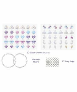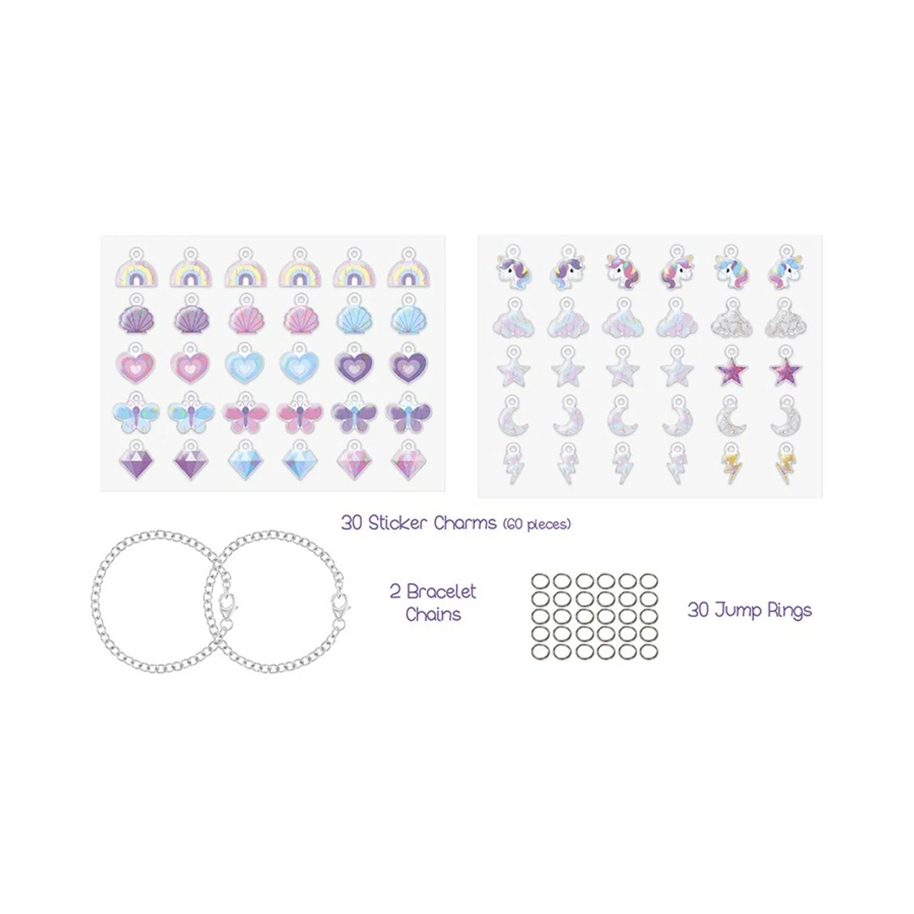 - Kit includes: 60 stickers charms (join together to make 30), 30 jump rings, 2 bracelet charms