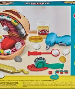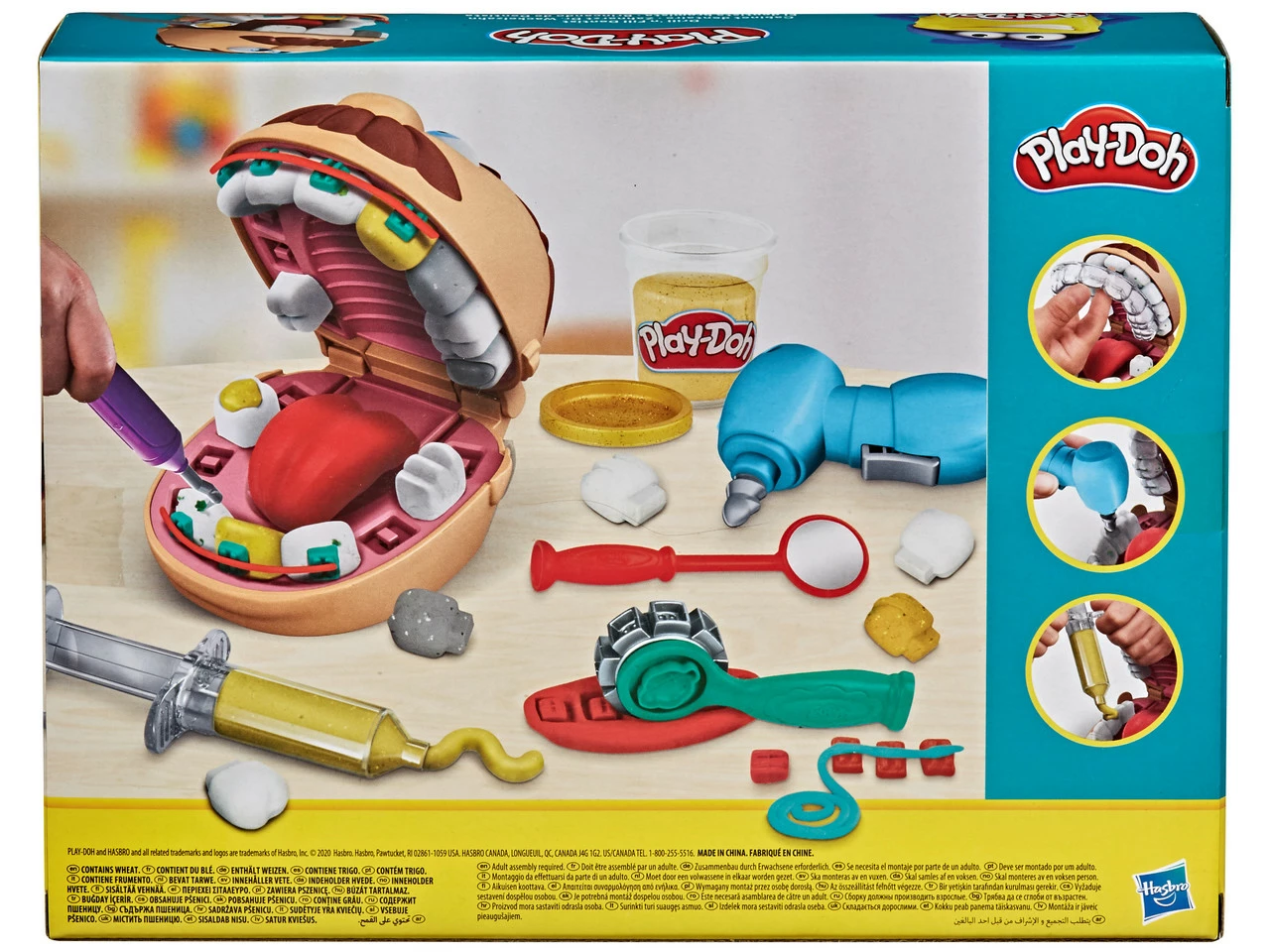 DRILL AND FILL PLAY-DOH TEETH: Use the hand-powered spinning toy drill to dig into those cavities, then squeeze Play-Doh fillings from the syringe extruder to fix them right up