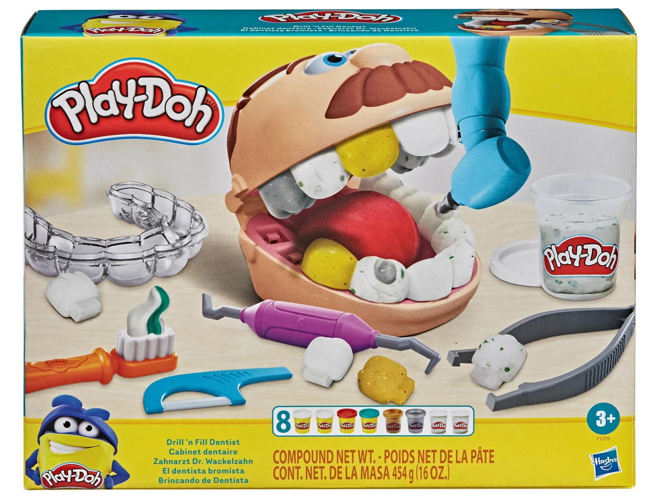 Doctor, drill ‘n fill that patient before he gets a toothache! Even if it can be a little scary to go to the dentist, kids can take control and play pretend dentist with this Play-Doh playset. They can make the patient stick out his Play-Doh tongue, then use the toy tooth mold to create a whole row of Play-Doh teeth at once. Start drillin’ and fillin’ with the hand-powered toy drill and syringe extruder tool. Cavity-colored modeling compound has green speckles to look like the patient has gunk in his teeth, and gold and silver Play-Doh colors make great braces and fillings. With a total of 10 toy dental tools and 8 non-toxic Play-Doh cans, this toy dentist kit makes a great activity or gift for kids 3 years and up!
