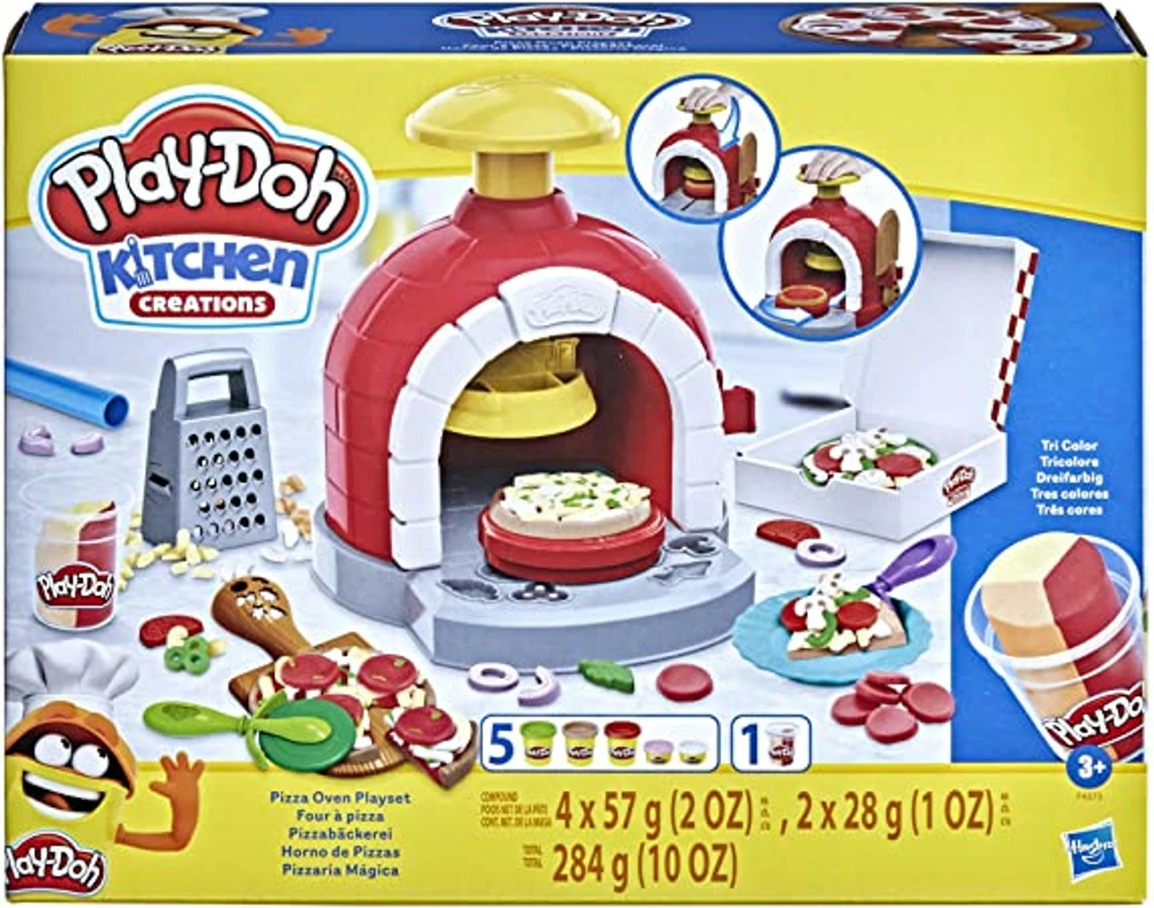 Imagination is on the menu with this toy pizza oven! Kids can play pretend chef as they stamp and spin out creative Play-Doh pizzas with over 25 possible pretend toppings. The play food set includes 8 tools to help inspire future cooks’ creativity, and 6 modeling compound colors including a tricolor can with pizza-themed colors. Kids can also get their pretend pizzas ready for delivery in the pizza box. This Play-Doh set makes a great activity, gift, or arts and crafts toy for kids 3 years and up! Hasbro, Play-Doh, and all related properties are trademarks of Hasbro.