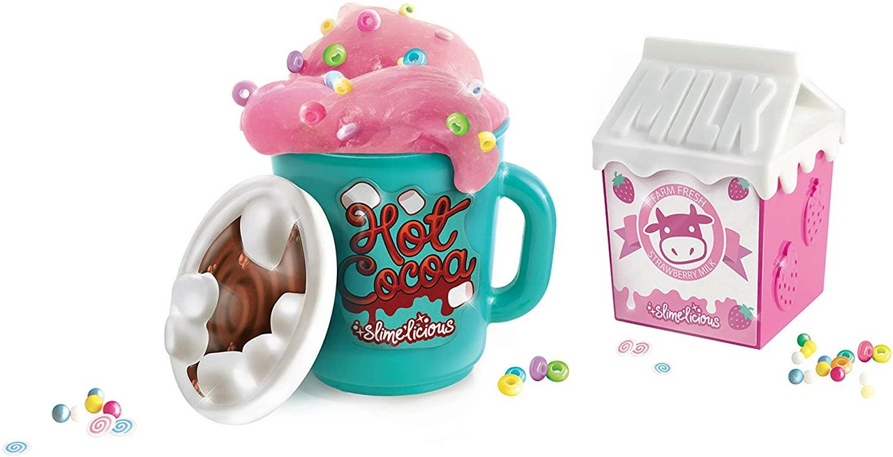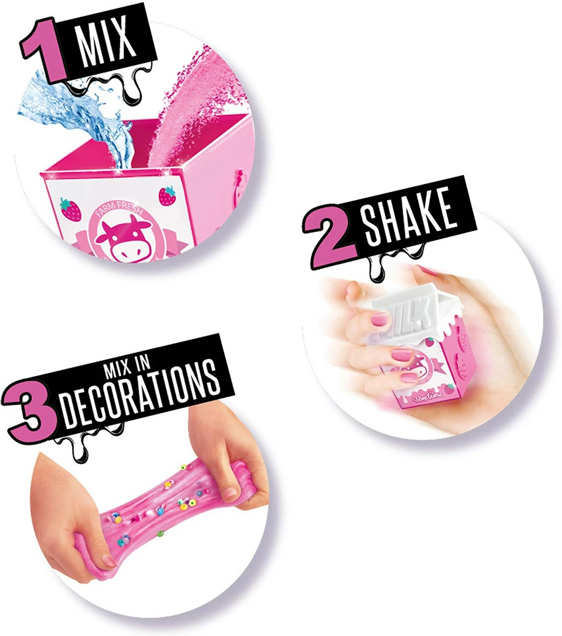 The vanity case comes with everything you need to make 5 scented slimes: grape, bubble gum, chocolate, popcorn, and strawberry! You can store them in one of the cute slime shakers that look like a mug of hot cocoa or a milk carton. You can even customize them with stickers to make them SO YOU, SO COOL, SO DIY! Perfect to surprise your friends with your favorite scent!