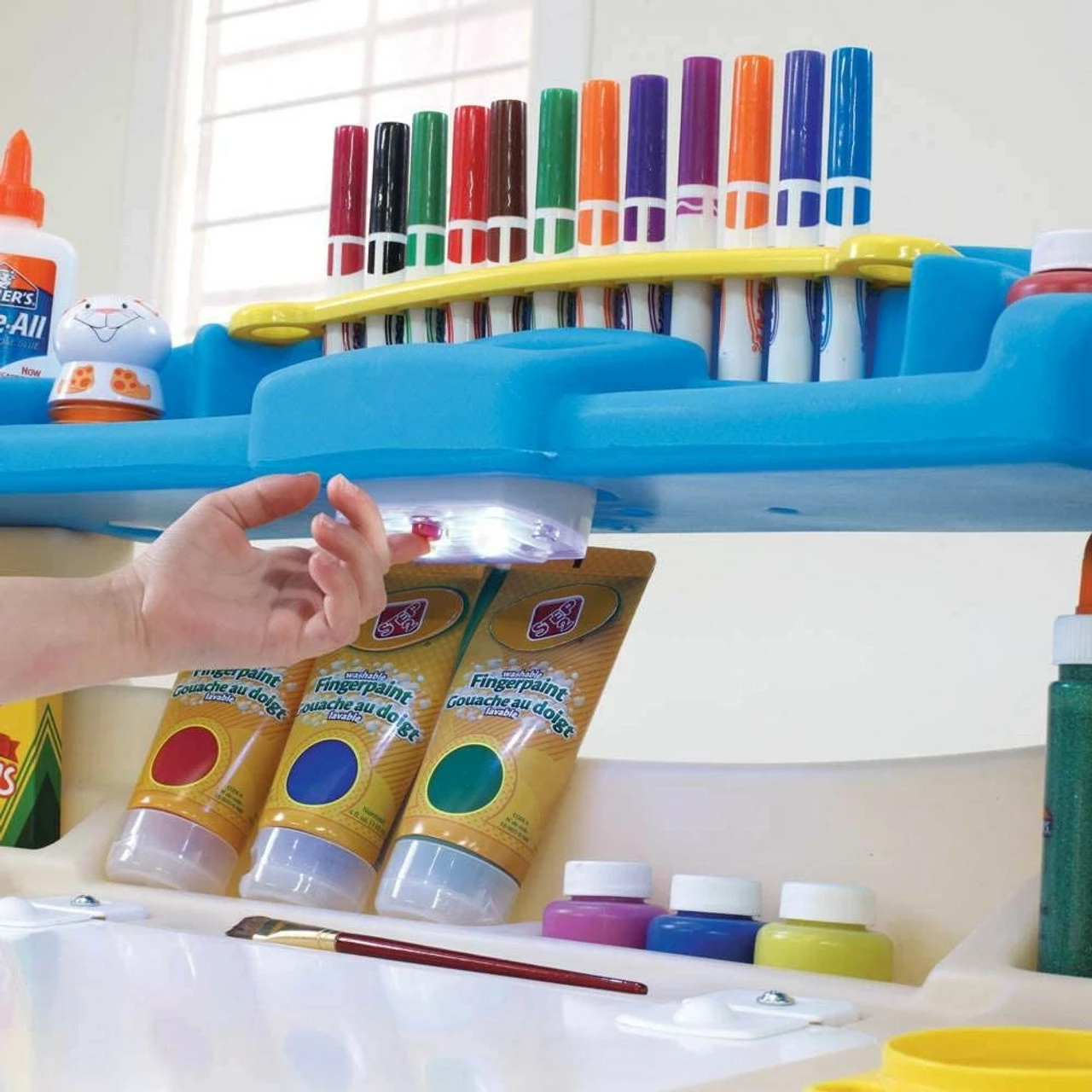 - Pull up the matching chair, click on the overhead desk light, and get creative with paper and paints, or use the desktop whiteboard with dry-erase markers for quick sketches.